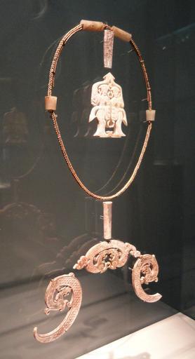 | Keywords: Pendants, beads, and gold chain, view 1, Jincun, central Henan, Warring States period, 475-221 BC, jade (nephrite) and gold - Freer Gallery of Art - DSC05759.JPG en Exhibit in the Freer Gallery of Art Washington DC USA This artwork is old enough so that it is in the public domain Photography was permitted in the museum without restriction 2013-02-12 16 23 10 own Daderot cc-zero Sculpture of China in the Freer Gallery Uploaded with UploadWizard Metalwork of the Warring States period | ||||