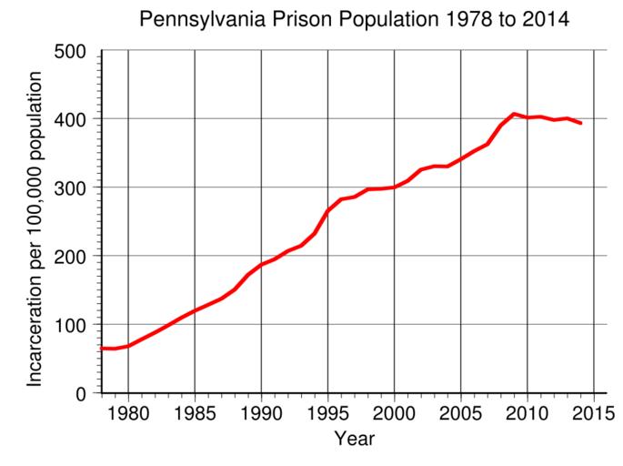 | Keywords: Pennsylvania Prison Population.svg en Pennsylvania prison incarceration rate per 100 000 population from 1978 to 2014 Data from http //www bjs gov/index cfm ty nps BJS 2016-05-11 own Delphi234 other versions current annually Generated with Wikimedia SVG Chart SVG Chart/box cc-zero Prisons in Pennsylvania Imprisonment and detention rates in the United States |