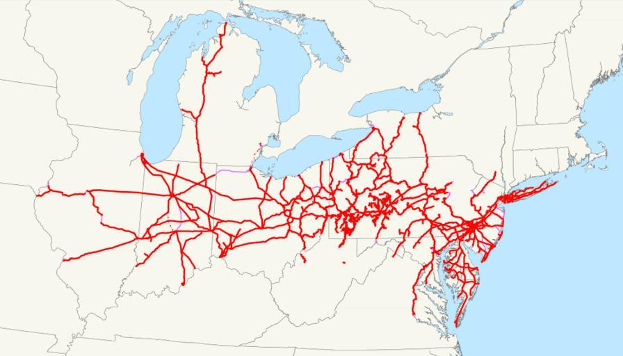 | Keywords: Pennsylvania Railroad system map (1918).svg This is a map of the Pennsylvania Railroad system as of 1918 with trackage rights in purple and future lines dotted The two disconnected pieces in West Virginia are not an error; they are remaining portions of the Little Kanawha Syndicate properties that were partially controlled by the PRR-owned Pennsylvania Company Email me if you would like a copy of the GIS data I created modified from Bureau of Transportation Statistics North American Transportation Atlas Data or if you see any errors 2009-03-18 own assumed NE2 Maps of the Pennsylvania Railroad |