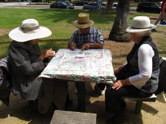 Keywords: people park woman man hats summer lifestyle outdoor leisure together fun spring adult cards card table game