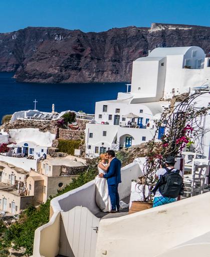 Keywords: people person couple wedding kissing happy santorini oia greece landscape water cliff nature sky architecture outdoors summer