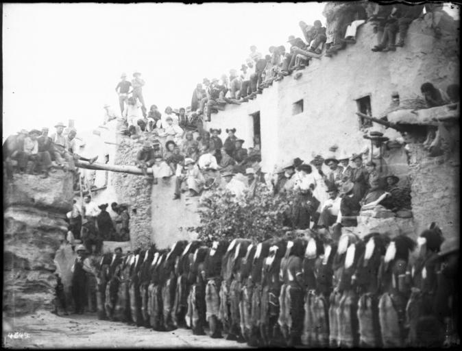 | Keywords: People watching snake priests in line before Kiva at the pueblo of Walpi, Arizona, ca.1897 (CHS-4649).jpg en <br> People watching snake priests in line before Kiva at the pueblo of Walpi Arizona ca 1897 Photograph of a large group people sitting on the steps and walls of an adobe building watching the long line of dozens of snake priests before the Kiva at the pueblo of Walpi Arizona ca 1897 The priests wear kilts with animal pelts hanging from them at back Each priest has white feathers in his hair The spectators include native Americans and white men alike Call number CHS-4649 Legacy record ID chs-m16973; USC-1-1-1-13888 Photographer James George Wharton Filename CHS-4649 Coverage date circa 1897 Part of collection California Historical Society Collection 1860-1960 Type images Geographic subject city or populated place Walpi Repository name USC Libraries Special Collections Accession number 4649 Microfiche number 1-170- Archival file chs_Volume97/CHS-4649 tiff Part of subcollection Title Insurance and Trust and C C Pierce Photography Collection 1860-1960 Repository address Doheny Memorial Library Los Angeles CA 90089-0189 Geographic subject country USA Format aacr2 3 photograph glass photonegative photoprints b w ; 17 x 22 cm 21 x 26 cm Rights Digitally reproduced by the USC Digital Library; From the California Historical Society Collection at the University of Southern California Subject adlf tribal areas Project USC Repository email specol usc edu Identifying number unidentified no James-313 Contributing entity California Historical Society Date created circa 1897 Publisher of the digital version University of Southern California Libraries Format aat photographic prints; photographs Geographic subject state Arizona Subject file heading Indians -- Hopi -- Snake Dance Geographic coordinates -110 397217 35 832218 Format glass plate negatives Access conditions Send requests to address or e-mail given Phone 213 821-2366; fax 213 740-2343 Geographic subject county Navajo Subject lcsh Indians of North America; Hopi Indians; Rites and ceremonies; Men Subject Hopi Indians; Hopi Snake Dance; Hopi Snake Dance Ceremony circa 1897 date created George Wharton James 1858 1923 http //digitallibrary usc edu/cdm/ref/collection/p15799coll65/id/16892 PD-old-70-1923 Images from USC Digital Library uploaded by Fæ Photographs by George Wharton James California Historical Society Collection 1860-1960 Glass plate negatives |