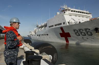 | Keywords: People's Liberation Army (Navy), RIMPAC 2014 140715-N-WX378-011.jpg en Boatswain's Mate 3rd Class Ian Learn assigned to the guided-missile destroyer USS Hopper DDG 70 stands by as the People's Liberation Army Navy hospital ship Peace Ark T-AH 866 departs Joint Base Pearl Harbor-Hickam during Rim of the Pacific RIMPAC Exercise 2014 Twenty-two nations 49 ships six submarines more than 200 aircraft and 25 000 personnel are participating in RIMPAC from June 26 to Aug 1 in and around the Hawaiian Islands and Southern California The world's largest international maritime exercise RIMPAC provides a unique training opportunity that helps participants foster and sustain the cooperative relationships that are critical to ensuring the safety of sea lanes and security on the world's oceans RIMPAC 2014 is the 24th exercise in the series that began in 1971 U S Navy photo by Mass Communication Specialist 2nd Class Bryan M Ilyankoff/Released 2014-07-15 Petty Officer 2nd Class Bryan Ilyankoff https //www dvidshub net/image/1452716 140715-N-WX378-011 2014-07-17 22 20 JOINT BASE PEARL HARBOR-HICKAM HI US PD-USGov-Military-Navy Foreign warships at Pearl Harbor USS Hopper DDG-70 RIMPAC 2014 Images from DoD uploaded by Fæ |