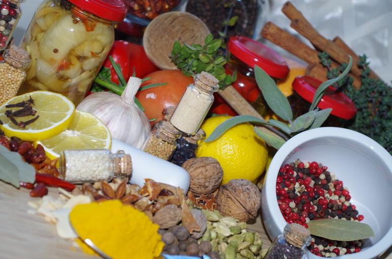 Keywords: pepper colorful cooking turmeric vegetables nutmeg flower lemon cloves garlic cups