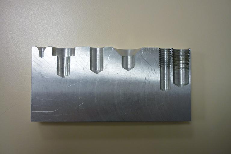 | Keywords: Percages.JPG en Various blind holes from left to right centering hole; hole with counter-boring; simple hole; countersunk hole; threaded holes The holes were machined in an aluminium block then the block was milled fr Différents perçages borgnes de gauche à droite trou de centrage ; trou lamé ; trou simple ; trou fraisuré ; trous taraudés Les trous ont été usinés dans un bloc d'aluminium puis le bloc a été fraisé own Cdang 2010-05-05 Drilling and threading | ||||