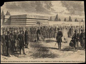 | Keywords: Père-Lachaise - Division 85 - enclos musulman 01.jpg Enterrement dans l'enclos musulman division 85 du cimetière du Père-Lachaise de Séliman-ben-Saïd lieutenant indigène au 2e régiment de tirailleurs algériens en garnison à Paris D'après le croquis de Gideon Baril 1865-04-08 Archives de Paris object history exhibition history credit line accession number 15Fi 582 http //www paris fr/politiques/Portal lut page multimedialist id 214 pnumber 7 page_id 149 pop 1 paris fr cite journal Maxime Vauvert Enterrement de Seliman-ben-Saïd Le Monde illustré 1865-04-08 221 16 417 http //gallica bnf fr/ark /12148/bpt6k6224535d/f12 PD-old Gustave Janet Gédéon Baril Grave of Séliman-ben-Saïd Père-Lachaise Cemetery in the 19th century Engravings of the Père-Lachaise Cemetery 1865 in art |