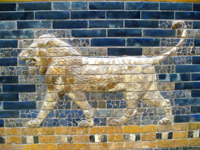 Keywords: Pergamon Museum Berlin 2007089.jpg Detail eines Löwens von der Thronsaalfassade Babylon farbig glasierte Ziegel 604-562 v Chr Detail of a lion from the facade of the Throne Room Babylon coloured glazed bricks 604-562 BCE The Throne-Room was situated in the third courtyard complex of the royal palace Its 56 m wide facade was decorated with coloured glazed bricks A tentative reconstruction show the composition of the upper part of the facade including stylised palms and patterned registers Two original sections are displayed on the left next to the Ishtar Gate The lower part of the facade with representations of striding lions was predominantly reconstructed from the original baked brick fragments The frieze of lions was presumably arranged symmetrically so that the animals faced toward the central main entrance to the throne-room cf the direction of movement in the reconstruction opposite The throne-room was excavated by Robert Koldewey from 1899 to 1917 It was used as an official reception room Own 2007 Gryffindor Image may be used for any purpose 100px Reliefs of lions on the Ishtar Gate |
