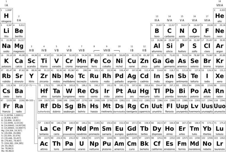 | Keywords: Periodic table simple it bw.svg en Simple periodic table with localized element names and standard atomic weights IUPAC 2009 Temporarily converted to paths till fixing Wikipedia ™s font problem with DejaVu Sans Condensed but also the previous version of this image works correctly outside of Wikipedia 2013-09-27 17 47 32 own László Németh Source code ; Created in LibreOffice 4 1 2 with this LibreLogo program ; Usage Put this code into an English language document in LibO Writer ; fix one program line for older LibreOffice versions see FIXME in the code ; and click on the Start icon of the View»Toolbars»Logo toolbar ; NEED INTERNET CONNECTION TO RUN THIS PROGRAM table data downloaded from Wikipedia lang input Language de el en fr hu it ru bw int input Color 0 COLORED 1 BLACK/WHITE ; Source pages http //www wikidata org/wiki/Q13584100 uselang hu sources ru D0 A1 D0 BF D0 B8 D1 81 D0 BE D0 BA_ D1 85 D0 B8 D0 BC D0 B8 D1 87 D0 B5 D1 81 D0 BA D0 B8 D1 85_ D1 8D D0 BB D0 B5 D0 BC D0 B5 D0 BD D1 82 D0 BE D0 B2 2 fr Liste_des_ C3 A9l C3 A9ments_chimiques 2 de Liste_der_chemischen_Elemente 1 el CE 9A CE B1 CF 84 CE AC CE BB CE BF CE B3 CE BF CF 82_ CF 87 CE B7 CE BC CE B9 CE BA CF 8E CE BD_ CF 83 CF 84 CE BF CE B9 CF 87 CE B5 CE AF CF 89 CE BD_ CE BA CE B1 CF 84 CE AC_ CE B1 CF 84 CE BF CE BC CE B9 CE BA CF 8C_ CE B1 CF 81 CE B9 CE B8 CE BC CF 8C 2 it Elementi_per_numero_atomico 2 hu K C3 A9miai_elemek_list C3 A1ja 3 if lang en langpage sourceslang0 langfield sourceslang1 ; column with element names on the Wikipedia page GLOBAL annotation posx posy size font font2 lang font DejaVu Sans font2 DejaVu Sans Condensed ; Wikimedia has got problem with it convert the result to path in Inkscape if needed posx 30 posy 40 size 42 ; load and process element data from Wikipedia embedded Python exec import urllib request exec data urllib request urlopen http //en wikipedia org/w/index php action raw title List_of_elements readlines exec table for j in i decode utf-8 replace style \\\ background-color 0x replace \\\ split for i in data if re match \ \d+ \ \ i decode utf-8 ; load and process other language data IF lang en exec data urllib request urlopen http // s wikipedia org/w/index php action raw title s readlines lang langpage IF lang de exec langtable i decode utf-8 split d strip split -1 for i in data if re match \ \d+ \ \ i decode utf-8 langfield-1 ; process and sort German data exec langtable i decode utf-8 split 0 split 0 split -1 strip \t split 0 split < 0 split 0 strip \t split -1 int i decode utf-8 split 2 strip \t for i in data if re match \ \t \d+ \t \ \ i decode utf-8 exec import operator exec langtable sort key operator itemgetter 1 exec langtable i0 for i in langtable langtable ; a few fixes table793 Mercury ; instead of Mercury element table117 24 31 ; Mg table257 55 85 ; Fe table637 157 3 ; Gd ; add missing positions TO the table FOR i IN RANGE 56 71 tablei5 i “ 56 “ 4 tablei6 8 5 FOR i IN RANGE 88 103 tablei5 i “ 88 “ 4 tablei6 9 5 ; helper functions TO width_of_last_object OUTPUT _ drawpage getByIndex _ drawpage getCount -1 getSize Width / 100 __MM_TO_PT__; IN PT END ; FIXME remove the space before the END TO delete_last_object _ drawpage remove _ drawpage getByIndex _ drawpage getCount -1 END TO element size d l18n bw PENUP POSITION posx + INT d5 size posy + FLOAT d6 size 1 2 HEADING 0 ; show group number IF INT d0 IN 1 2 4 5 6 7 8 9 21 22 23 24 25 26 27 28 29 30 IF lang en FORWARD size/2 + size/5 LABEL 0 1 d5 FORWARD size/2 + size/5 LABEL 0 4 5 d5 groupname 1 I ¯A 2 II ¯A 3 III ¯B 4 IV ¯B 5 V ¯B 6 VI ¯B 7 VII ¯B 8 • ” ” ” 9 VIII ¯B 10 ” ” ” •® 11 I ¯B 12 II ¯B 13 III ¯A 14 IV ¯A 15 V ¯A 16 VI ¯A 17 VII ¯A 18 VIII ¯A d5 IF lang not in hu groupname SUB groupname FONTSIZE 10 LABEL 0 1 groupname BACK size/2 + size/5 IF bw FILLCOLOR WHITE FILLCOLOR INT d1 PENDOWN RECTANGLE size size 1 2 PENUP IF M IN d2 OR m IN d2 OR 2 < COUNT d2 FONTFAMILY font2 FONTFAMILY font FONTWEIGHT BOLD FONTSIZE size/2 1 TEXT d2 FONTWEIGHT UPRIGHT FONTFAMILY font BACK size 1 2/2-size/20 fontsiz 5 6 FONTSIZE size/fontsiz IF l18n name l18nINT d0 -1 name d3 if lang de name name lower LABEL 0 1 name fontdescratio 492/2048 ; DejaVu Sans Condensed IF width_of_last_object > size 0 95 delete_last_object FONTFAMILY font2 LABEL 0 1 name width width_of_last_object IF width > size 0 95 delete_last_object fontsiz2 size/fontsiz size/width 0 95 FORWARD size/fontsiz fontdescratio - fontsiz2 fontdescratio FONTSIZE fontsiz2 LABEL 0 1 name BACK size/fontsiz fontdescratio - fontsiz2 fontdescratio FONTSIZE size/5 8 FONTFAMILY font2 FORWARD -size/2 + size/20 size 1 2/2-size/20 + size 0 6 “ size/20 HEADING 0 LABEL 1 -1 d0 RIGHT 90 FORWARD size “ size/10 LEFT 90 weight FINDALL \d+ \d+ \\d+\ d7 0 IF weight0 wsize COUNT FINDALL \d+ weight 0 w2size COUNT FINDALL \d+ weight 0 IF w2size > 4 “ wsize weight + STR 4 “ wsize + f FLOAT weight IF d2 IN H Li B C N O Mg Si S Cl Br Zn Se Mo Tl weight weight + IF lang not in en weight SUB weight LABEL -1 -1 weight END HOME CLEARSCREEN HIDETURTLE PENSIZE 0 5 PENUP bwtext FALSE TRUE _bw bw ; save black and white images with _bw label PICTURE periodic_table_simple_ s s svg lang bwtext FONTSIZE size/5 8 FONTFAMILY font2 ; legend POSITION posx + size/2 + size/5 8/2 posy + size 1 2 7 5 + size/20 HEADING 0 LABEL -1 -1 legend H 1 00784 1 00811\nLi 6 938 6 997\nB 10 806 10 821\nC 12 0096 12 0116\nN 14 00643 14 00728\nO 15 99903 15 99977\nMg 24 304 24 307\nSi 26 084 26 086\nS 32 059 32 076\nCl 35 446 35 457\nBr 79 901 79 907\nTl 204 382 204 385\nZn 65 38 2 \nSe 78 96 3 \nMo 95 96 2 if lang not in en legend SUB legend LABEL 1 -1 legend POSITION posx + size 3 5 posy + size 1 2 8 5 HEADING 0 PENDOWN LEFT 90 FORWARD 2 size/5/3 RIGHT 90 FORWARD size 1 2 3 “ size/20 “ size/5 8/2 LEFT 90 FORWARD 5 size/5/3 PENUP POSITION posx + 2 5 size + size/20 posy + size 5 5 1 2 + size/20 HEADING 0 LABEL 1 -1 57 “71 PENUP POSITION posx + size 3 5 posy + size 1 2 9