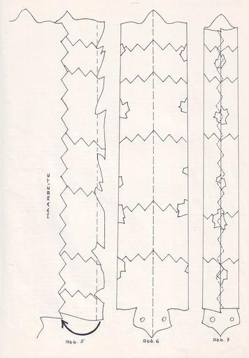 Keywords: Persianer-Mantel-Verarbeitung 5 - Versetzen.jpg Persianermantelverarbeitung Eine große Hilfe für die Weiterverarbeitung ist wenn man immer der Reihe nach den schon eingeschnittenen Streifen vor sich hinlegt um sich mit dem folgenden einzuschneidenden Streifen zum besseren Angleich nach dem angrenzenden Streifen richten zu können Wenn also von vornherein nicht jeder Streifen separat behandelt wird und man sich angewöhnt immer das ganze Mantelbild im Auge zu behalten so kann dadurch viel Zeit und Mühe gespart werden 5 Ausstückeln Abb 4 5 6 und 7 Nach dem Nähen der Aufsätze kann man die Streifen etwas anfeuchten die Nähte ausrollen und den ganzen Streifen schon etwas in die erforderliche Form ziehen Jetzt beginnt man mit dem Ausstückeln der Rückenmitte und kann dann wieder wie beim Einschneiden mit den angrenzenden Streifen fortfahren Zuerst wird der Grotzen durchgerädelt und angezeichnet mit Fettstift die erforderliche Breite angegeben und auf diese Linie die Längszacke mittels Schablone gezeichnet Auch Naturpersianer wird wesentlich schöner wenn man die Längsnähte mit Zacke macht Das weit verbreitete Zusammensetzen mit einer geraden Naht wird immer damit gerechtfertigt dass man bei Naturpersianer die Längsnähte sowieso sehe und folglich eine Zacke unsauberer wirke als eine gerade Naht Diese Ansicht ist abzulehnen denn sie beweist dass auf gutes Passen der nebeneinander liegenden Streifen von vornherein nicht genügende Sorgfalt angewendet wurde Das beim Einschneiden beachtete Harmonieren der angrenzenden Streifen kommt jetzt hierbei zugute Ist der Streifen lang genug so kann an besonders schmalen Stellen mit einer Treppe leicht Breite gewonnen werden Abb 4 c zeigt diesen Vorgang angezeichnet Abb 4 d zeigt die Treppe herausgerückt Am Kopf muss wenn man mit abfallenden Köpfen fehlende Fläche ergänzt der zum Ansetzen verwendete Kopf mittels Zacke geteilt und parallel zum Grotzen angesetzt werden Abb 4 e Ist nun die Rückenmitte fertig so wird der nächstfolgende Streifen danach passend ausgestückelt Man legt wie Abb 5 zeigt den schon fertigen Streifen mit der Haarseite auf den angrenzenden auszustückelnden Streifen und kann indem man diesen immer wieder umklappt schon beim Stückeln auf ein gutes Zusammenpassen achten Wenn das Haar zu sehr aneinander stößt so schneidet man es an einer Seite mit der Schere ab Noch eine Methode soll hier erwähnt werden welche die sparsamste Ausnutzung des Materials gewährleistet Der Streifen wird an beiden Seiten glatt abgeschnitten Abb 6 und zu einem Schlauch zusammen genäht Auf diese Naht wird dann die Zacke gezeichnet und aufgeschnitten Es geht hierbei kein Material durch die Zacke verloren An die Ober- und Untertrittstreifen wird gleich genügend Umbug angesetzt Die Ärmel werden nach gleicher Methode gearbeitet Durch das gleichzeitige Ausstückeln und Zacken schneiden kann man das gesamte Werkstück schon zusammen nähen lassen In kleinen Arbeitspausen werden schon eine Anzahl Ellipsen geschnitten und auf eine Pappe gelegt 6 Kommt der genähte Körper von der Maschine wird er ausgerollt und senkrecht auf eine Platte gestiftet Jetzt kann man die plackigen und unschönen Stellen anstecken Hat man sich die Ellipsen zum Einsetzen schon vorher nach Lockengröße auf-sortiert so kann man innerhalb ganz kurzer Zeit die schlechten Stellen auswechseln und dem Mantel den letzten Schliff geben Das einfache Herumdrehen von Ellipsen ist kein nur annähernder Ersatz für das Auswechseln 7 Wird der Mantel nun gezweckt so sollte er vorher gut gefattet haben Persianer mit dem Haar nach oben zu zwecken ist nicht immer sehr angenehm zu arbeiten Man kann besser normal mit dem Leder nach oben zwecken und danach das Ganze hochheben Bei dickerem Material ist es kein Fehler wenn die Locke etwas flachgedrückt wird Die Rückenmitte und die Grotzen des Ober- und Untertrittes werden mit Stecknadeln gerichtet so dass die letzteren parallel zur vorderen Kante verlaufen Alle Lammarten müssen gut trocken sein bevor sie abgezweckt werden und vor dem Abgleichen geraume Zeit liegen bleiben own 1962-10 Rudolf Toursel de German Wikipedia 1 <gallery> File Persianer-Mantel-Verarbeitung 1 - Abstrecken jpg File Persianer-Mantel-Verarbeitung 2 - Besatz jpg File Persianer-Mantel-Verarbeitung 3 - Einschnitte jpg File Persianer-Mantel-Verarbeitung 4 - Einschneiden jpg </gallery> Karakul fur-skin manufacturing Pelze Rudolf Toursel |