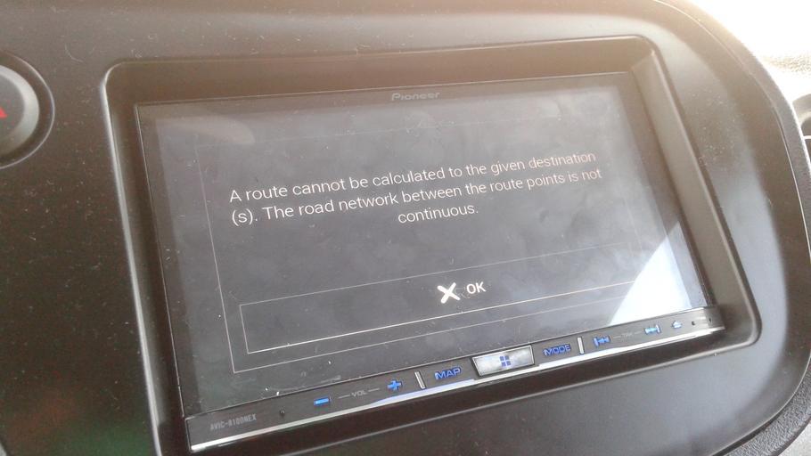 Keywords: uploaded with flync uploadedwithflync pioneer headunit gps error Update: It works now! I installed a free map update for Maryland and surrounding Middle Atlantic states and that solved the problems. The system will find an address on the map, and it can be 2 miles away or 20 miles away on an uncomplicated route on major highways, and when I hit "Select As Destination" it will give me this message. "A route cannot be calculated to the given destination(s). The road network between the route points is not continuous." When we drive to the address and hit the "Home" button the GPS has no problems. It only happens for a couple addresses, but it always happens with them, and it is not an easy fix. For example, we get it for 1620 Reisterstown Rd. in Pikesville, MD, and it repeats if you try 1600, 1500, 1700 or just "Reisterstown Rd" w/o a street number. What is up with that? Update: It works now! I installed a free map update for Maryland and surrounding Middle Atlantic states and that solved the problems. The system will find an address on the map, and it can be 2 miles away or 20 miles away on an uncomplicated route on major highways, and when I hit "Select As Destination" it will give me this message. "A route cannot be calculated to the given destination(s). The road network between the route points is not continuous." When we drive to the address and hit the "Home" button the GPS has no problems. It only happens for a couple addresses, but it always happens with them, and it is not an easy fix. For example, we get it for 1620 Reisterstown Rd. in Pikesville, MD, and it repeats if you try 1600, 1500, 1700 or just "Reisterstown Rd" w/o a street number. What is up with that? |