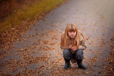 Keywords: person human child girl long hair view away out nature leaves autumn autumn mood portrait