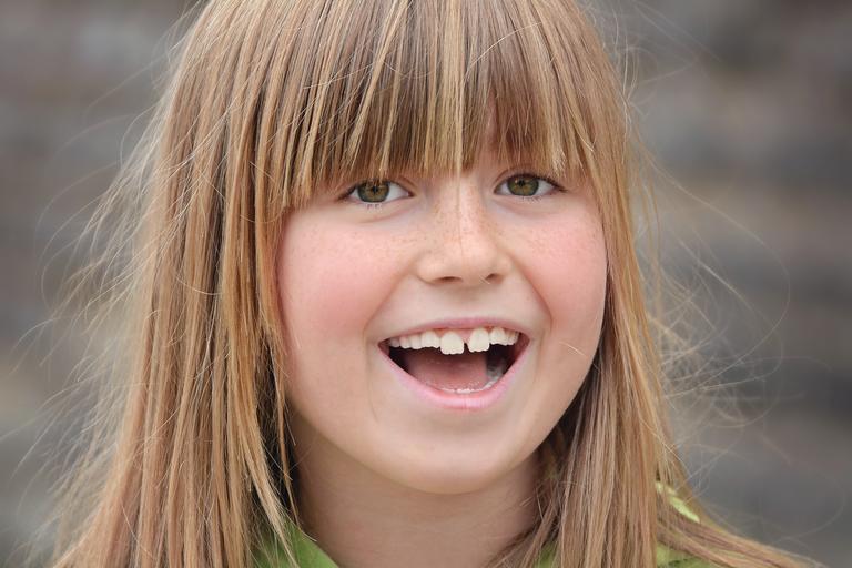 Keywords: person human child girl female face laugh view blond portrait close