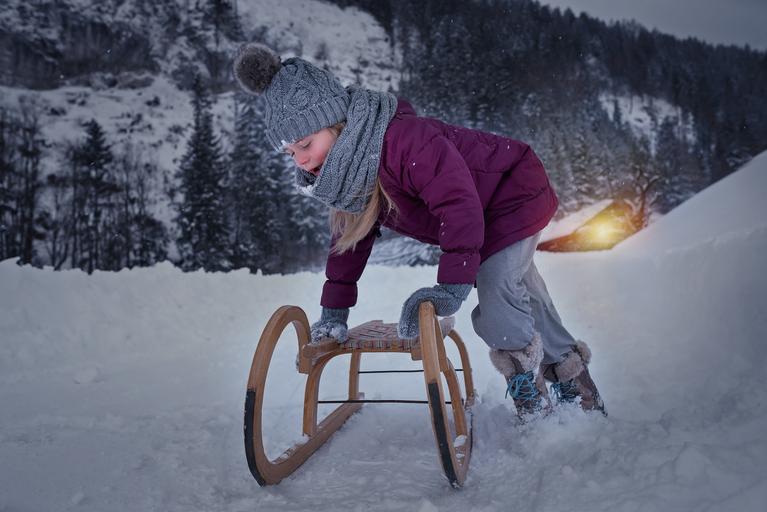 Keywords: person human child girl slide toboggan winter snow cold twilight childhood out nature