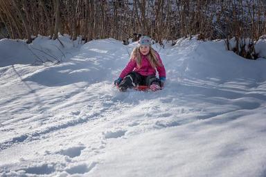 Keywords: person human child girl winter snow bob ride on slip fun winter fun in motion