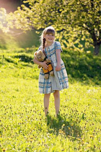 Keywords: person human child girl blond dress teddy teddy bear meadow nature out portrait