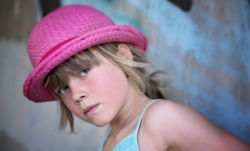 Keywords: person human child girl view face expression hat portrait close