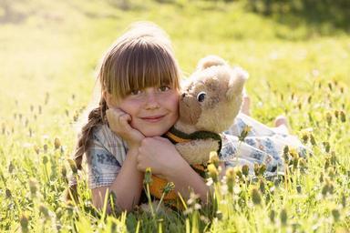 Keywords: person human female child girl blond face teddy teddy bear meadow grass nature out sunlight portrait