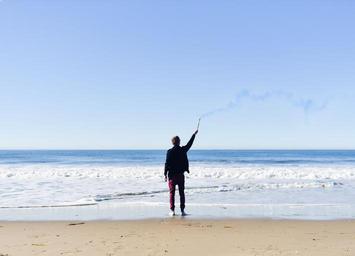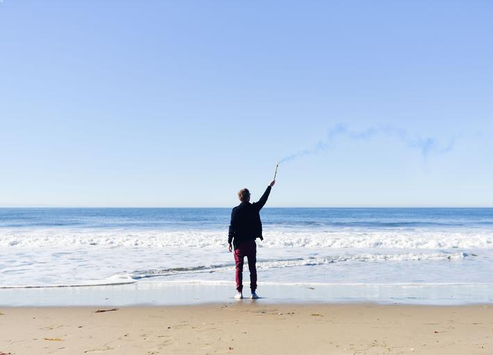 Keywords: person male beach lifestyle man torch outdoors sos help smoke smoke signal stick guy sand waves ocean sea shore blue sky people