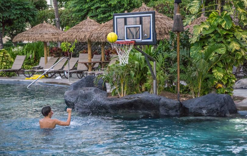 Keywords: person people boy basketball pool resort playing young white fun recreation ball in air tropical exotic huts