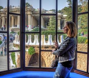 Keywords: person people woman barcelona spain gaudi guell park architecture travel lifestyle city female caucasian young tourist girl happy europe tourism outdoor catalonia smiling urban