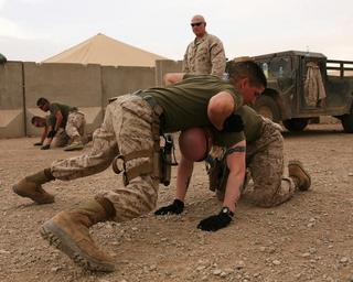 Keywords: Personal Security Detail Marines Stay Sharp With Regular Training DVIDS263230.jpg en Gunnery Sgt Jeremy Gohl team leader for the Combat Logistics Battalion 6 Personal Security Detail supervises his Marines as they practice ground fighting techniques Feb 6 The detail is comprised of members pulled from several occupational fields; including military police and motor transport operators and provides armed security for the battalion commander 2010-02-06 Sgt Justin Shemanski https //www dvidshub net/image/263230 263230 2010-03-26 06 28 CAMP LEATHERNECK AF PD-USGov Camp Leatherneck Images from DoD uploaded by Fæ |