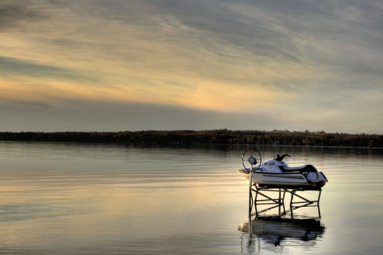 Keywords: personal watercraft lake sunset scenic serene landscape jetski dusk pigeon lake alberta canada