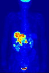 Keywords: PET-MIPS anim frame.PNG en Maximum Intensity Projection MIP of a wholebody positron emission tomography PET acquisition of a 79 kg weighting female after intravenous injection of 371 MBq of <sup>18</sup>F-FDG one hour prior measurement The investigation has been performed as part of a tumor diagnosis prior to applying a radiotherapy tumor staging step Besides normal accumulation of the tracer in the heart bladder kidneys and brain liver metastases of a colorectal tumor are clearly visible within the abdominal region of the image de Maximumintensitätsprojektion MIP einer Ganzkörperaufnahme mittels Positronen-Emissions-Tomographie PET Die Aufnahme zeigt eine 79 kg schwere weibliche Patientin nach intravenöser Injektion von 371 MBq <sup>18</sup>F-FDG eine Stunde vor Messung Die Untersuchung wurde im Rahmen einer Tumordiagnose vor Anwendung einer Strahlentherapie sogn Tumorstaging durchgeführt Neben den normalen Anreicherungen des Tracers in Herz Blase Nieren und Gehirn sind auch Lebermetastasen eines kolorektalen Tumor im abdominalen Bereich der Aufnahme auszumachen fr Projection d'intensité maximale MIP d'un corps entier par topographie à émission de positons TEP d'une femme de 79 kg après une injection intraveineuse de 371 MBq de <sup>18</sup>F-FDG une heure avant la mesure L'étude a été réalisée lors d'un diagnostic de tumeur avant d'appliquer une radiothérapie étape tumeur Outre l'accumulation normale du traceur dans le cœur la vessie des reins et du cerveau des métastases hépatiques d'une tumeur colorectale sont clairement visibles dans la région abdominale de l'image PET-MIPS-anim gif 2006-05-22 Jens Langner http //www jens-langner de/ Damato Positron emission tomography |