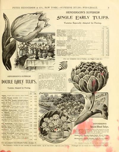 Keywords: Peter Henderson and Co.'s August to December 1901 wholesale catalogue of bulbs, plants and seeds, tools, fertilizers, insecticides, and requisites for the greenhouse, garden and farm (16236601673).jpg PETER HENDERSON CO NEW YORK ” SUPERIOR BULBS ” WHOLESALE <br> HENDERSON'S SUPERIOR <br> S INGLE EARLY T ULIP5 <br> Varieties Especially Adapted for Forcing <br> Artus bright orange redefine bold flcnuer <br> Belle Alliance brilliant scarlet large and fine <br> Canary Bird rich golden yellow fine forcer <br> Chrysolora rich bright yellow large fiower <br> Cottage Maid carmine pink feathered white <br> Due Van Thol Scarlet dwarf early forcer <br> White <br> Yellow <br> Red Yellow <br> Duchesse de Parma bright red with yellow band large <br> Kaiser Kroon deep crimson with yellow band large and effective <br> L'lmmaculee /«r 'white -very early and file forcer <br> Mon Tresor the finest early yellow Tulip grown <br> Pottebakker Scarlet bright Scarlet large fine flower <br> White large pure white fine forcer <br> 11 Yellow large fine pure yellow <br> Queen Victoria La ReineJ white occasionally flushed with rose <br> Rembrandt rich crimson scarlet large and early <br> Rose oris d'lin rose shaded white extra fine <br> Rosa Mundi Huyckman rose feathered white <br> Vermillion Brilliants dazzling ver million extra fine <br> Yellow Prince large bright yellow <br> Prices <br> 100 I 1000 <br> so <br> 1 00 <br> 1 35 <br> 1 25 <br> 1 00 <br> 1 00 <br> 1 35 <br> 1 50 <br> 85 <br> 75 <br> 1 25 <br> 85 <br> 1 60 <br> 1 00 <br> 1 35 <br> 1 35 <br> 85 <br> 1 25 <br> 1 50 <br> S5 <br> ' 50 <br> 1 25 <br> r oo <br> 9 50 <br> 11 00 <br> lu OO <br> 9 00 <br> 8 00 <br> 12 00 <br> 14 00 <br> r oo <br> 6 50 <br> 11 00 <br> r oo <br> 15 U0 <br> 9 00 <br> 12 00 <br> 12 00 <br> 7 50 <br> 11 00 <br> 14 00 <br> r so <br> 22 00 <br> 10 00 <br> For our Complete List of Tulips see Pages ° and 10 <br> 1 ULIP CRIMSON KINO <br> HENDERSON'S SUPERIOR <br> DOUBLE EflRLy TULIPS <br> Varieties Adapted for Forcing <br> Agnes bright fiery scarlet large double <br> Jloiver <br> Double Purple Crown dark crimson <br> Z'elvety and jine <br> Due Van Thol double red and yellow <br> very early dwarf and Jine for forcing <br> Duke of York very double carmine rose <br> edged broadly -with white stiff ttsed rose <br> shozuy and fine <br> Gloria Solis a grand flower deep crim- <br> son ˘with broad golden margin very <br> large <br> Imperator Rubrorum splendid bright <br> scarlet yellow base a fine full double <br> Le Blason delicate rose shaded and <br> striped with white extra fine <br> La Candeur pure white very jull and <br> la rge extensively grown <br> Lion d Orange brilliant orange dwarf <br> extra choice good forcer <br> Murillo Albino magnificent blush white <br> shaded rose large flowers fine for forc- <br> ing <br> Rex Rubrorum bright crimson scarlet <br> superb for bed ling large and showy <br> Rosine blush ˘white tinged rose <br> Salvator Rosa beautiful deep rose flamed <br> with wh ite fine for forcing <br> Tournesol showy orange scarlet ˘with <br> broad yellow tips and yellow base Very <br> large double flower <br> Yellow Tournesol bright golden yellow <br> shaded orange Very fine large and <br> showy flower forces ˘well <br> Yellow Rose Pure This is the early- <br> flowering large pure golden yellow var- <br> iety fragrant <br> For our complete list of Double Tulips see page 10 <br> Special lixed Tulips <br> This grade of Mixed Tulips is far superior to the <br> ordinary mixtures being made up from named <br> sorts proper proportions of bright colors all <br> blooming together and of uniform height <br> Henderson's Special Single Early Mixed Tulips <br> 15c per doz 85c per 100 7 00 per 1000 <br> Henderson's Special Double Early Mixed Tulips <br> 18c per doz 90c per 100 8 00 per 10 <br> For Standard Quality Mixed Tulips sec pages Q-IO <br> We furnish 6 bulbs of one variety at dozen rates ; 25 at 100 rates ; 250 at 1 000 rates Postage will be extra on bulbs desired by mail 42318926 133706 66577 Page 3 Text http //www biodiversitylibrary org/page/42318926 1901 10 5962/bhl title 66577 Henry G Gilbert Nursery and Seed Trade Catalog Collection ; Peter Henderson Co NameFound Rubrorum NameFound Salvator NameConfirmed Salvator NameBankID 212455 NameFound Solis NameFound Tournesol NameConfirmed Tournesol Adans EOLID 5281101 Biodiversity Heritage Library Peter Henderson Co 's August to December 1901 wholesale catalogue of bulbs plants and seeds tools fertilizers insecticides and requisites for the greenhouse garden and farm Garden Stories Catalogs Fertilizers Flowers Insecticides Peter Henderson Co Plants Ornamental Seed industry and trade Seeds Trade catalogs U S Department of Agriculture National Agricultural Library bhl page 42318926 dc identifier http //biodiversitylibrary org/page/42318926 bhlGardenStories Tulips Bulbs Plants BHLinbloom peter henderson co plants ornamental u s department of agriculture national agricultural library bhlgardenstories bulbs plants bhlinbloom Information field Flickr posted date ISOdate 2015-03-18 CC-BY-2 0 BioDivLibrary https //flickr com/photos/61021753 N02/16236601673 2015-08-24 19 50 30 cc-by-2 0 PD-old-70-1923 Tulips Peter Henderson and Co 's August to December 1901 wholesale catalogue of bulbs plants and seeds tools fertilizers insecticides and requisites for the greenhouse garden and farm Photos uploaded from Flickr by Fæ using a script |