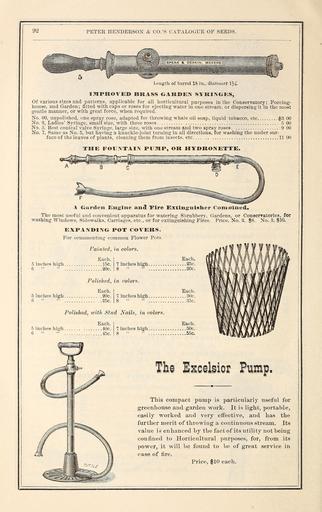| Keywords: Peter Henderson and Co's seed catalogue (16251137637).jpg 92 <br> PETER HENDERSON CO S CATALOGUE OF SEEDS <br> SPEAK DEAKIN MAK ERS; <br> JF <br> 5 <br> Length of barrel 18 in diameter V/ <br> IMPROVED BRASS GARDEN SYRINGES <br> Of various sizes and patterns applicable for all horticultural purposes in the Conservatory; Forcing- <br> house and Garden; fitted with caps or roses for ejecting water in one stream or dispersing it in the most <br> gentle manner or with great force when required <br> No 00 unpolished one spray rose adapted for throwing whale oil soap liquid tobacco etc 3 00 <br> No 2 Ladies' Syringe small size with three roses 5 00 <br> No 5 Best conical' valve Syringe large size with one stream and two spray roses 9 00 <br> No 7 Same as No 5 but having a knuckle-joint turning in all directions for washing the under sur- <br> face of the leaves of plants cleaning them from insects etc 11 00 <br> THE FOUNTAIN PUMP OR HYDRONETTE <br> A Garden Engine and Fire Extinguisher ‚¬oniolned <br> The most useful and convenient apparatus for watering Shrubbery Gardens or Conservatories for <br> washing Windows Sidewalks Carriages etc or for extinguishing Fires Price No 2 8 No 3 10 <br> EXPANDING POT COVERS <br> For ornamenting common Flower Pots <br> Painted in colors <br> 5 inches high <br> 6 ' r <br> Each I Each <br> 15c 7 inches high 25c <br> 20c 8 ff 30c <br> 5 inches high <br> 6 <br> Polished in colors <br> Each I Each <br> 20c 7 inches high 30c <br> 25c I 8 35c <br> Polished with Stud Xails in colors <br> Each <br> 5 inches high 40c <br> 6 45c <br> Each <br> 7 inches high 50c <br> 55c <br> The Iisilsijf Pomp <br> This compact pump is particularly useful for <br> greenhouse and garden work It is light portable <br> easily worked and very effective and has the <br> further merit of throwing a continuous stream Its <br> value is enhanced by the fact of its utility not being- <br> con fined to Horticultural purposes for from its <br> power it will be found to be of great service in <br> case of fire <br> Price 10 each 43797091 148915 77745 Page 92 Text http //www biodiversitylibrary org/page/43797091 1875 10 5962/bhl title 77745 Henry G Gilbert Nursery and Seed Trade Catalog Collection ; Peter Henderson Co Biodiversity Heritage Library Peter Henderson Co's seed catalogue 1875 new album Garden Stories Catalogs Equipment and supplies Gardening Peter Henderson Co Seed industry and trade Seeds Trade catalogs U S Department of Agriculture National Agricultural Library bhl page 43797091 dc identifier http //biodiversitylibrary org/page/43797091 bhlGardenStories BHLinbloom peter henderson co u s department of agriculture national agricultural library bhlgardenstories bhlinbloom Information field Flickr posted date ISOdate 2015-02-03 CC-BY-2 0 BioDivLibrary https //flickr com/photos/61021753 N02/16251137637 2015-08-24 05 54 12 cc-by-2 0 PD-old-70-1923 1875 books Peter Henderson Co's seed catalogue Photos uploaded from Flickr by Fæ using a script |