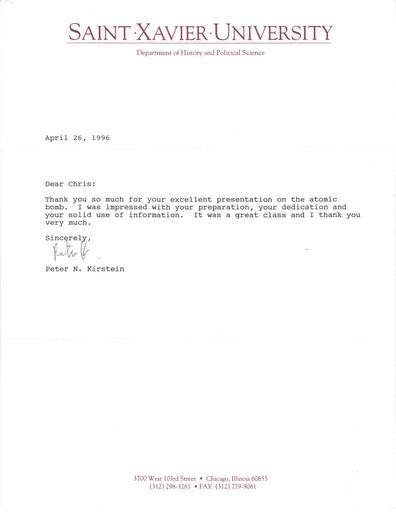 Keywords: Peter.Kirstein.jpg en Commendation to Christine Mouser for delivering presentation on the Nuclear Bomb 1996-04-26 St Xavier University Department of History and Political Science Professor Peter N Kirstein other versions Peter N Kirstein Uploaded with UploadWizard Manhattan Project |