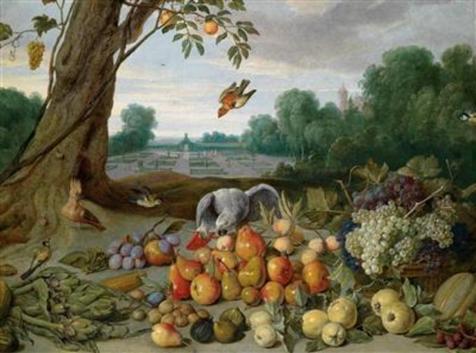 Keywords: Peter van Boucle – A still life with fruits and birds before a formal garden.jpg Artwork Creator Peter van Boucle firsthalf other date century 17 oil canvas size cm 117 5 155 3 Private collection object history credit line Sold at Dorotheum on 21 October 2014 accession number http //www dorotheum com/it/aste/calendario-aste/prossime-aste/kataloge/list-lots-detail/auktion/10841-dipinti-antichi/lot/1773542-peter-van-boeckel-ii html PD-old-100 Peter van Boucle 17th-century still life paintings in private collections Oil still life paintings Paintings of grapes 17th-century still life paintings of fruits Still life paintings with living parrots Still-life paintings of living animals |