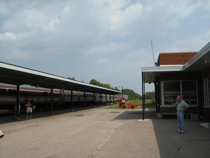 | Keywords: Petersburg VA Amtrak station 4.jpg Petersburg Amtrak station in Virginia - view of the station and platform with Amtrak train heading north own 2010-08-27 CZmarlin ” Christopher Ziemnowicz releases all rights but a photo credit would be appreciated if this image is used anywhere other than Wikipedia Please leave a note at Wikipedia http //en wikipedia org/w/index php title User_talk CZmarlin action edit section new here Thank you en I the copyright holder of this work hereby release it into the public domain This applies worldwide thumb left The rear of the station viewed from under the canopy over the platform thumb center View towards the north thumb left Detail of the rear station entrance that looks over the platform and trains thumb center Closer detail of Amtrak train stop facing from platform to the south thumb left North bound Amtrak train while stopped in Petersburg VA Petersburg Amtrak station |