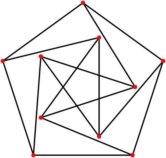 Keywords: Petersen graph, unit distance.svg The Petersen graph as a unit distance graph all edges the same length David Benbennick wrote this SVG file I release all rights to it The edge lengths are not exactly the same They are only accurate to about 1 part in 10<sup>42</sup> That's accurate enough so that if you scale this graph up to the size of the observable universe about 10<sup>24</sup> km according to w Universe the error is about the size of the classical electron radius Petersen graph |