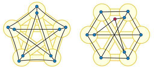 Keywords: Petersen Wagner minors.svg graph minors of Wagner's theorem K<sub>5</sub> left and K<sub>3 3</sub> right in the nonplanar Petersen graph The Petersen graph is shown with the small colored disks as vertices and with solid black edges Its minors shown in pale yellow may be formed by deleting the red vertex and contracting the edges that lie within a single yellow circle 2013-02-06 14 28 42 own David Eppstein cc-zero Files by User David Eppstein from en wikipedia Petersen graph |