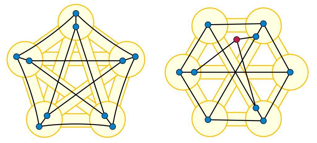| Keywords: Petersen Wagner minors.svg graph minors of Wagner's theorem K<sub>5</sub> left and K<sub>3 3</sub> right in the nonplanar Petersen graph The Petersen graph is shown with the small colored disks as vertices and with solid black edges Its minors shown in pale yellow may be formed by deleting the red vertex and contracting the edges that lie within a single yellow circle 2013-02-06 14 28 42 own David Eppstein cc-zero Files by User David Eppstein from en wikipedia Petersen graph | ||||