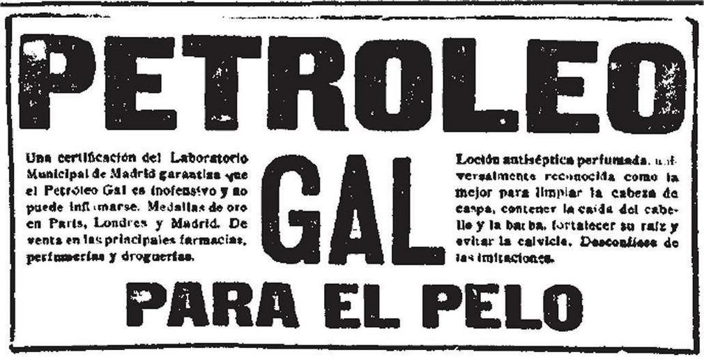 Keywords: Petroleo-Gal-1910-02-01correspondencia-.jpg it Petroleo Gal inserzione del 1 2 1910 su La Correspondencia de España http //hemerotecadigital bne es/datos1/numeros/internet/Madrid/Correspondencia 20de 20Espa C3 B1a 20La/1910/191002/19100201/19100201_18983 pdf search 22capilar 22 page 7 La Correspondencia de España 1 2 1910 pag 7 La Correspondencia de España 1 2 1910 es PETROLEO GAL PARA EL PELO Una certification del Laboratorio Municipal de Madrid garantiza que el Petrolio Gal es inofensivo y no puede inflamarse Medallas de oro en Paris Londres y Madrid De venta en las principales farmacias perfumerias y drogheria Locion antiseptica perfumada universalmente reconocida como la major para limpiar la cabeza de caspa contener la caida del cabello y la barba fortalecer su raiz y evitar la calvicie Dsconfies de las imitaciones PD-old Petróleo Gal 1910 La Correspondencia de España advertisements 1910 advertisements in Spain ImageNote 1 23 56 982 446 1032 523 2 PETROLEO GAL PARA EL PELO Una certification del Laboratorio Municipal de Madrid garantiza que el Petrolio Gal es inofensivo y no puede inflamarse Medallas de oro en Paris Londres y Madrid De venta en las principales farmacias perfumerias y drogheria Locion antiseptica perfumada universalmente reconocida como la major para limpiar la cabeza de caspa contener la caida del cabello y la barba fortalecer su raiz y evitar la calvicie Dsconfies de las imitaciones ImageNoteEnd 1 |