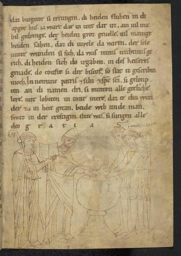 Keywords: Pfaffe Konrad - Rolandslied - cod. pal. germ. 112 - 011.jpg Pfaffe Konrad - Rolandslied - cod pal germ 112 - jpg 010 012 Turpin auch Tilpin Erzbischof von Reims tauft den spanischen Heiden Daneben Diakon l und vermutlich zwei Taufpaten r Rolandslied des Pfaffen Konrad à bersetzung bzw Bearbeitung der altfranzösischen Chanson de Roland um 1100 Blatt 5r Pfaffe Konrad Rolandslied Pergament 123 Blatt 21x15 cm Regensburg/Hessen-Thüringen Ende 12 Jahrhundert Cod pal germ 112 Universitätsbibliothek Heidelberg http //diglit ub uni-heidelberg de/diglit/cpg112 century 12 Pfaffe Konrad PD-old Rolandslied Cod Pal germ 112 Baptism in art Saint Remigius Clovis I |