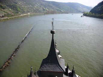 Keywords: PfalzgrafensteinTurmblickSüd.JPG de Blick aus dem Dachfenster des Burgturms der Pfalzgrafenstein nach Süden Zu sehen ist links im Rhein das Leitwerk das zur Insel Kauber Werth führt Quer zum Leitwerk lassen sich nach rechts durch Wellenbildung mindestens fünf bis sechs Buhnen unterscheiden die bei dem aktuellen Kauber Pegel von 289 cm unter Wasser stehen Ihre Länge macht deutlich dass die Fahrrinne des Rheins wegen Untiefen in weitem Abstand westlich am Pfalzgrafenstein vorbeiführt own Brühl 2009-05-10 Burg Pfalzgrafenstein |