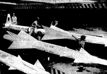Keywords: blackandwhite monochrome black background outdoor black and white NIKE MISSILES STORED UNDERGROUND - To reduce the area required for a launching site and provide greater protection for adjoining communities from possible explosions, all Nike missies are stored underground in huge concrete walled vaults. Hydraulic equipment opens large doors above 'the storace area and lifts the missiles into launching position. These vaults will be shown to the public during the Open House Saturday at the Village Green site. NIKE MISSILES STORED UNDERGROUND - To reduce the area required for a launching site and provide greater protection for adjoining communities from possible explosions, all Nike missies are stored underground in huge concrete walled vaults. Hydraulic equipment opens large doors above 'the storace area and lifts the missiles into launching position. These vaults will be shown to the public during the Open House Saturday at the Village Green site. |