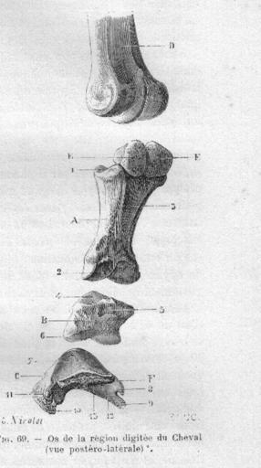 | Keywords: PhalChevalChauveauCM1890.jpg en The bones of the digit region of the horse Equus caballus phalanges postero-lateral view fr Les os de la région du doigt du cheval Equus caballus phalanges vue postéro-latérale <br /> A phalange proximale <br /> B phalange médiale <br /> C phalange distale <br /> D extrémité inférieure des os métacarpiens <br /> E grands sésamoïdes <br /> F petit sésamoïde <br /> ” Chauveau Auguste Arloing Saturnin Traité d'anatomie comparée des animaux domestiques <br /> 1 064 p page 123 1890 Paris Lib J B Baillière et Fils domaine public décès des auteurs 1917 et 1911 Meyer C 2011-03-15 PD-old Horse leg bones Phalanges of the foot |