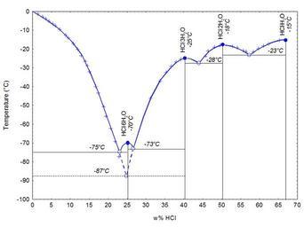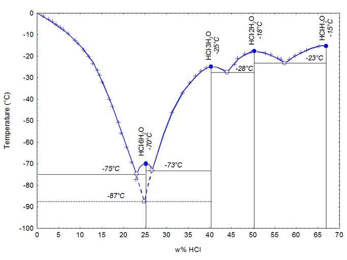 Keywords: Phase diagram HCl H2O s l.PNG en Solid-liquid phase diagram of binary HCl water mixtures de fest-flüssig Phasendiagramm von HCl-Wasser-Mischungen own Steffen 962 2009-11-13 erstellt aus Daten vom Gmelins Handbuch der anorganischen Chemie plotted with data from the German books Gmelins Handbuch der Anorganischen Chemie Systemnummer 6 Chlor Verlag Chemie Berlin 1927 and Gmelins Handbuch der Anorganischen Chemie Systemnummer 6 Chlor Ergänzungsband Teil B - Lieferung 1 Verlag Chemie Weinheim 1968 Since 1990 the Gmelin was published as Gmelin Handbook of Inorganic and Organometallic Chemistry Phase change diagrams Melting Hydrochloric acid Hydrogen chloride Binary phase diagrams |