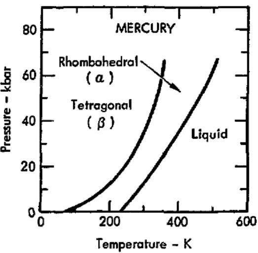 | Keywords: Phase diagram of mercury (1975).png en These 1975 phase diagrams are generally incomplete reaching at most 250 kbar 25 GPa and thus lacking many high-pressure metallic phases Taken from Phase Diagrams of the Elements David A Young UCRL-51902 Prepared for the U S Energy Research Development Administration under contract No W-7405-Eng-48 From the document DISTRIBUTION OF THIS DOCUMENT IS UNLIMITED ; printed copies were available from the w National Technical Information Service http //www osti gov/bridge/servlets/purl/4010212-0BbwUC/4010212 pdf David A Young 1975-09-11 Phase diagrams PD-USGov |