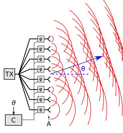 Keywords: Phased array antenna system.svg phased array antenna works A phased array is a computer controlled antenna which produces a beam of radio waves that can be steered electronically to point in different directions They are widely used in military radar The phased array consists of an array of multiple identical antenna elements A driven by a transmitter TX The feed current for each antenna passes through a device called a phase shifter φ which is controlled by a computer control system C The red lines show the wavefronts surfaces of constant phase of the radio waves emitted by each antenna The waves of the individual antennas are spherical but combine superpose in front of the antenna to make a plane wave a beam of radio waves traveling in a specific direction The phase shifters progressively delay the phase of radio waves by a fixed amount going up the line of antennas so each antenna emits its wavefront after the antenna below it creating a beam of radio waves directed at an angle θ to the plane of antennas By changing the phase delay of the phase shifters the computer control system can instantly steer the beam to any direction over a wide angle in front of the antenna Actual phased arrays use a two dimensional plane array of antennas rather than the line of antennas shown here 2016-12-07 own Chetvorno other versions cc-zero Phased array diagrams Array antennas |