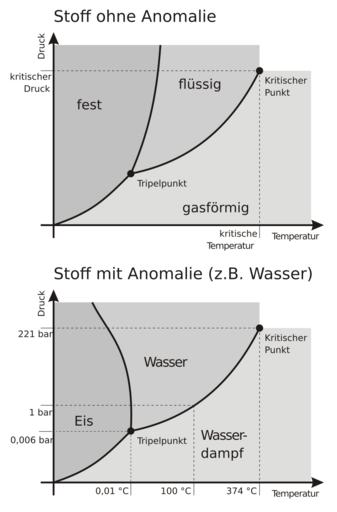 Keywords: Phasendiagramme.svg Die Abbildung zeigt die schematischen Phasendiagramme eines Stoffes ohne Dichteanomalie oben und des Wassers de File Phasendiagramme png http //resources jwidmer de/wikipedia/Phasendiagramme cdr 2005-01-15 de Benutzer JoWi Phasendiagramme en svg translation possible JoWi Water phase diagrams |