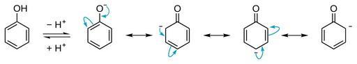 Keywords: Phenol-phenolate equilibrium.svg Phenol proton dissosiation to form phenolate and its stabilization by resonance Selfmade with ChemDraw 2006-12 Calvero Phenol Mesomerism Phenoxide ion