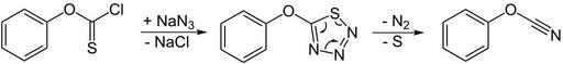 | Keywords: Phenylcyanate-synthesis-thermolysis.svg en Synthesis of phenylcyanate by thermolysis of 5-phenoxy-1 2 3 4-thiatriazole made of O-phenyl carbonochloridothioate and sodium azide First published by D Martin 1964 own Wampenseppl 2011-08-31 created with Inkscape validSVG Cc-zero Thermolysis |