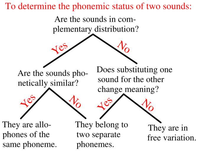 Keywords: Phoneme-allophone-determination-chart.svg Simplified chart / decision tree to determine whether two sounds which occur in the words of a language are allophones of the same phoneme separate phonemes or in free variation For explanations of terms and procedures see articles Allophone Complementary distribution Minimal pair Free variation and Phoneme The classic example of sounds which are in complementary distribution in a language but which are not usually considered to be allophones of the same phoneme due to phonetic dissimilarity is the sounds h and ŋ in English Self-made graphic converted from the following vector PostScript source code <pre> -40 0 translate 1 0 0 setrgbcolor/Times-Roman 30 selectfont 71 65 moveto 543 0 rlineto 0 414 rlineto -543 0 rlineto closepath stroke gsave 33 69 rotate 365 149 moveto Y show -2 0 rmoveto es show grestore gsave -33 69 rotate 130 510 moveto No show grestore gsave 46 7788 rotate 226 21 moveto Y show -2 0 rmoveto es show grestore gsave -39 5226 rotate 70 322 moveto No show grestore gsave 46 3119 rotate 365 5 -135 moveto Y show -2 0 rmoveto es show grestore gsave -37 4054 rotate 246 432 moveto No show grestore 4 setlinewidth 1 setlinecap/Times-Roman 26 selectfont 85 454 moveto To determine the phonemic status of two sounds show 0 setgray/Times-Roman 24 selectfont 220 419 moveto Are the sounds in com- show 216 392 moveto plementary distribution show 119 271 moveto Are the sounds pho- show 120 244 moveto netically similar show 336 281 moveto Does substituting one show 339 254 moveto sound for the other show 339 227 moveto change meaning show 77 130 moveto They are allo- show 78 103 moveto phones of the show 78 76 moveto same phoneme show 277 130 moveto They belong to show 281 103 moveto two separate show 281 76 moveto phonemes show 477 121 moveto They are in show 475 94 moveto free variation show 326 385 moveto -135 -90 rmoveto 135 90 rlineto 120 -80 rlineto stroke 206 237 moveto -78 -83 rmoveto 78 83 rlineto 100 -82 5 rlineto stroke 410 221 moveto -64 -67 rmoveto 64 67 rlineto 102 -78 rlineto stroke showpage EOF</pre> 2011 AnonMoos Phonology Tree diagrams Decision diagrams Images with PostScript source code |