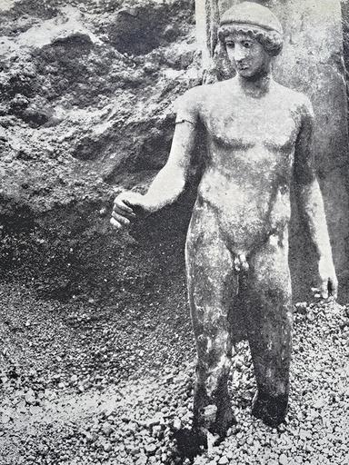 | Keywords: pompeii pompei ephebe naples archaeological museum archaeologicalmuseum amedeo maiuri amedeomaiuri outdoor La foto, scattata a maggio 1925, mostra la scoperta a Pompei della statua in bronzo di un "Efebo" da parte di Amedeo Maiuri, da appena un anno direttore degli scavi. È lui stesso che racconta la vicenda nel libro "Vita d'Archeologo". Si stava scavando la casa di Publio Cornelio Tegete, forse di antica origine etrusca, certamente arricchitosi con la fabbricazione e il commercio di stuoie e pagliarelle. La statua, originariamente collocata su una base circolare nel giardino per illuminare, con un candelabro a più bracci che aveva in mano, le cene del padrone, era stata rimossa e collocata nell'atrio. Inoltre era stata coperta da un pesante drappo, di cui restano tracce della trama ossidata sulla superficie della scultura. Che i proprietari, prima di fuggire per l'eruzione, abbiano voluta proteggerla? La straordinaria bellezza dell'Efebo fece addirittura ipotizzare una datazione al V sec. a. C., mentre oggi si propende a ritenerlo opera di età augustea, eseguita tra il 20 e il 10 a. C. Restaurato di recente a spese del "Villa Council del J. Paul Getty Museum" di Malibu (California), è da poco ricomparso nelle sale del Museo Archeologico di Napoli. La foto, scattata a maggio 1925, mostra la scoperta a Pompei della statua in bronzo di un "Efebo" da parte di Amedeo Maiuri, da appena un anno direttore degli scavi. È lui stesso che racconta la vicenda nel libro "Vita d'Archeologo". Si stava scavando la casa di Publio Cornelio Tegete, forse di antica origine etrusca, certamente arricchitosi con la fabbricazione e il commercio di stuoie e pagliarelle. La statua, originariamente collocata su una base circolare nel giardino per illuminare, con un candelabro a più bracci che aveva in mano, le cene del padrone, era stata rimossa e collocata nell'atrio. Inoltre era stata coperta da un pesante drappo, di cui restano tracce della trama ossidata sulla superficie della scultura. Che i proprietari, prima di fuggire per l'eruzione, abbiano voluta proteggerla? La straordinaria bellezza dell'Efebo fece addirittura ipotizzare una datazione al V sec. a. C., mentre oggi si propende a ritenerlo opera di età augustea, eseguita tra il 20 e il 10 a. C. Restaurato di recente a spese del "Villa Council del J. Paul Getty Museum" di Malibu (California), è da poco ricomparso nelle sale del Museo Archeologico di Napoli. |
