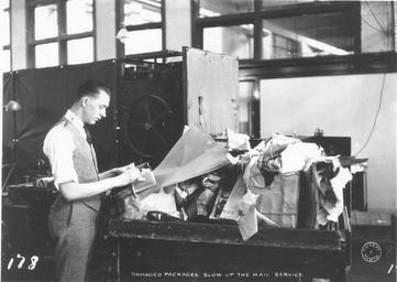 Keywords: smithsonian institution smithsonianinstitution man 1913 mail packages damage broken crushed standing instructional postal damaged goods damagedgoods postal packages postalpackages package wrapping packagewrapping photographic tutorial photographictutorial post office postoffice mail machines mailmachines mail across the commons mailacrossthecommons dead letter office deadletteroffice national postal museum nationalpostalmuseum blackandwhite monochrome black and white Date: 1913 Object number: A.2009-41 Medium: paper; photo-emulsion Description: After the introduction of Parcel Post Service on January 1, 1913, the Post Office Department began a series of instructional photographs and stories on the proper methods of wrapping a package for mailing. This photograph, numbered 178, is part of a series of photographs produced and distributed by the Department. The photograph shows that improperly wrapped packages might not make it through the postal system without sustaining damage or requiring special handling in the Department's Dead Letter Office. National Postal Museum, Curatorial Photographic Collection Photographer: Unknown Place: United States of America See more items in: National Postal Museum Collection Credit line: National Postal Museum, Curatorial Photographic Collection Photographer: Unknown Persistent URL:http://www.arago.si.edu/index.asp?con=2&cmd=1&id=207605 Repository:National Postal Museum View more collections from the Smithsonian Institution. Date: 1913 Object number: A.2009-41 Medium: paper; photo-emulsion Description: After the introduction of Parcel Post Service on January 1, 1913, the Post Office Department began a series of instructional photographs and stories on the proper methods of wrapping a package for mailing. This photograph, numbered 178, is part of a series of photographs produced and distributed by the Department. The photograph shows that improperly wrapped packages might not make it through the postal system without sustaining damage or requiring special handling in the Department's Dead Letter Office. National Postal Museum, Curatorial Photographic Collection Photographer: Unknown Place: United States of America See more items in: National Postal Museum Collection Credit line: National Postal Museum, Curatorial Photographic Collection Photographer: Unknown Persistent URL:http://www.arago.si.edu/index.asp?con=2&cmd=1&id=207605 Repository:National Postal Museum View more collections from the Smithsonian Institution. |