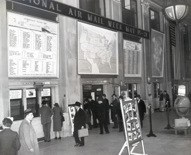 Keywords: smithsonian institution smithsonianinstitution post office postoffice architecture air mail airmail mail new york newyork 1938 national air mail week nationalairmailweek postal history postalhistory terminal station black and white blackandwhite national postal museum nationalpostalmuseum manhattan new york city newyorkcity midtown 421 eighth avenue 421eighthavenue 421 eighth ave. 421eighthave 421 8th avenue 4218thavenue 421 8th ave. 4218thave eighth avenue eighthavenue eighth ave. eighthave 31st street 31ststreet 31st st. 31stst 33rd street 33rdstreet 33rd st. 33rdst united states postal service unitedstatespostalservice usps united states post office unitedstatespostoffice us post office uspostoffice united states mail unitedstatesmail us mail usmail james a. farley post office building jamesafarleypostofficebuilding james farley post office building jamesfarleypostofficebuilding james farley post office jamesfarleypostoffice farley building farleybuilding farley post office farleypostoffice general post office building generalpostofficebuilding mckim, mead and white mckimmeadandwhite mckim, mead & white mckimmeadwhite beaux arts beauxarts lobby building black and white Date: May 15-21, 1938 Object number: A.2009-28 Medium: paper; photo-emulsion Description: Postmaster General James Farley designated May 15-21, 1938 as National Air Mail Week in recognition of the twentieth anniversary of the beginning of America's regular airmail service. Post office buildings across the country noted the anniversary with lobby displays celebrating the service. The nation-wide campaign was used to promote an increased use of airmail service by the public. At the time, the cost of domestic airmail service was twice that of regular mail (six cents versus three cents). National Postal Museum, Curatorial Photographic Collection Photographer: Unknown Place: United States of America      New York See more items in: National Postal Museum Collection Credit line: National Postal Museum, Curatorial Photographic Collection Photographer: Unknown Persistent URL:http://www.arago.si.edu/index.asp?con=2&cmd=1&id=207526 Repository:National Postal Museum View more collections from the Smithsonian Institution. Date: May 15-21, 1938 Object number: A.2009-28 Medium: paper; photo-emulsion Description: Postmaster General James Farley designated May 15-21, 1938 as National Air Mail Week in recognition of the twentieth anniversary of the beginning of America's regular airmail service. Post office buildings across the country noted the anniversary with lobby displays celebrating the service. The nation-wide campaign was used to promote an increased use of airmail service by the public. At the time, the cost of domestic airmail service was twice that of regular mail (six cents versus three cents). National Postal Museum, Curatorial Photographic Collection Photographer: Unknown Place: United States of America New York See more items in: National Postal Museum Collection Credit line: National Postal Museum, Curatorial Photographic Collection Photographer: Unknown Persistent URL:http://www.arago.si.edu/index.asp?con=2&cmd=1&id=207526 Repository:National Postal Museum View more collections from the Smithsonian Institution. |
